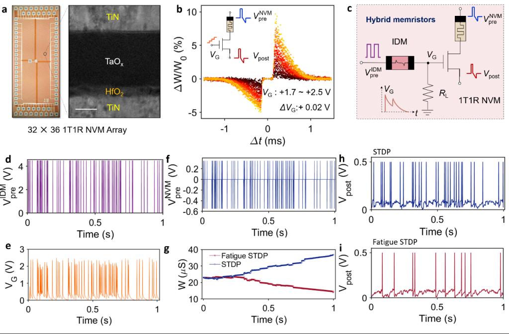 相关成果以“Spiking neural networks with fatigue spike-timing-dependent plasticity learning using hybrid memristor arrays”为题,发表于国际顶级期刊《自然·电子学》(Nature Electronics)。91直播 2024届博士毕业生党丙杰为第一作者,91直播 /广东省存算一体芯片重点实验室主任杨玉超教授为通讯作者。中国科学院物理研究所古林教授课题组为本论文TEM表征内容做了重要贡献。91直播 心理与认知科学学院教授吴思教授课题组也为本研究工作提供了宝贵意见。91直播 研究工作得到了国家重点研发计划、国家杰出青年基金、后摩尔重大研究计划、北京市自然科学基金、111计划、集成电路高精尖创新中心、新基石研究员等项目的资助。